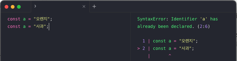 - 중복선언은 불가능하나 재선언이 가능하다 (let을 생략하고 재선언하면 된다.)