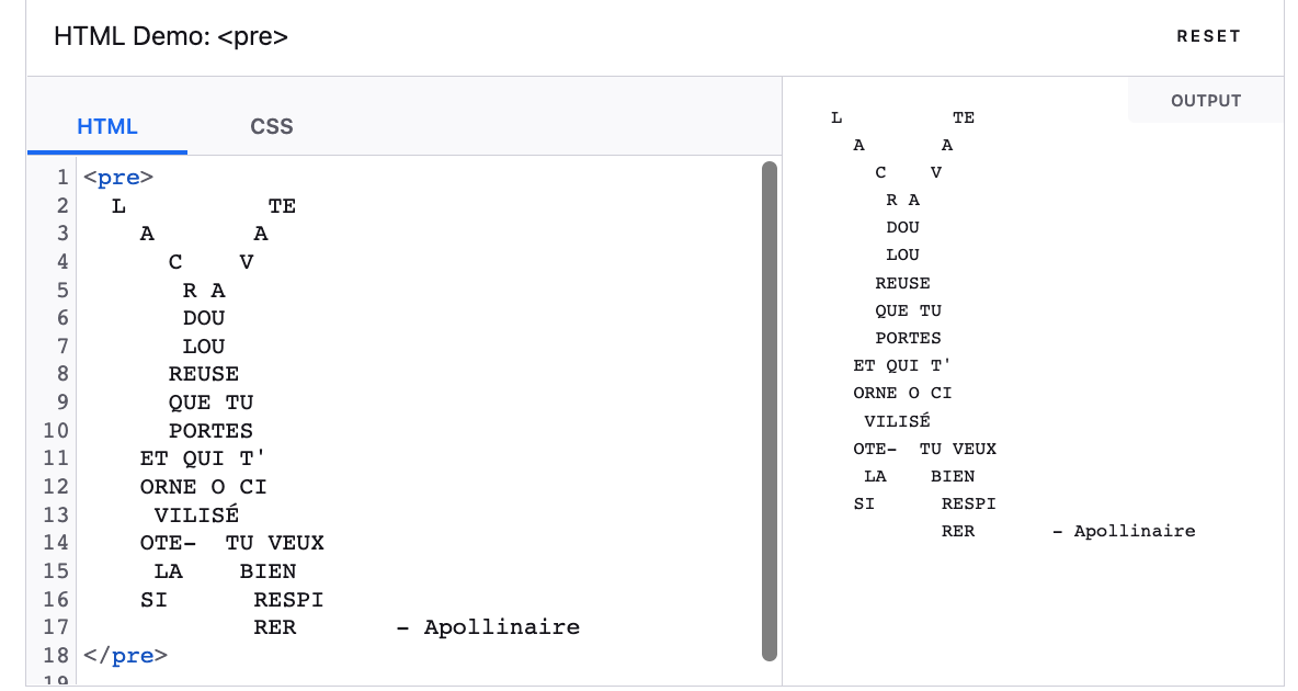 - 미리 서식을 지정한 텍스트 (preformated)를 나타내며 html에 작성한 내용 그대로 표현한다. 그 이유는 <pre> 안의 내용을 완성본으로 인식하여 별도의 처리 없이 output에 그대로 나타내며 (요소 내 공백 문자를 그대로 나타낸다.) 텍스트는 보통 고정폭 글꼴을 사용해 렌더링 하여 글꼴의 폭을 동일하게 나타낸다.
