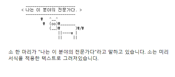 소 한 마리가 "나는 이 분야의 전문가다"라고 말하고 있습니다. 소는 미리 서식을 적용한 텍스트로 그려져있습니다.