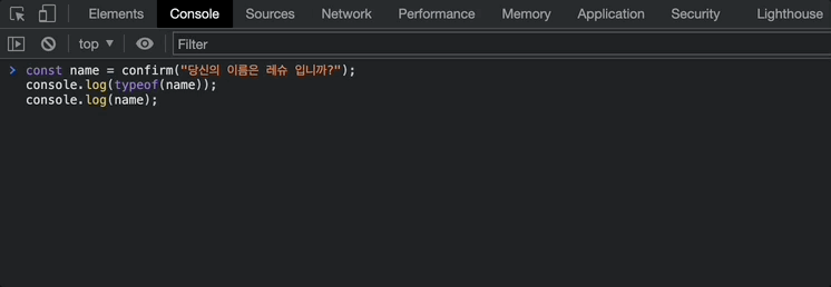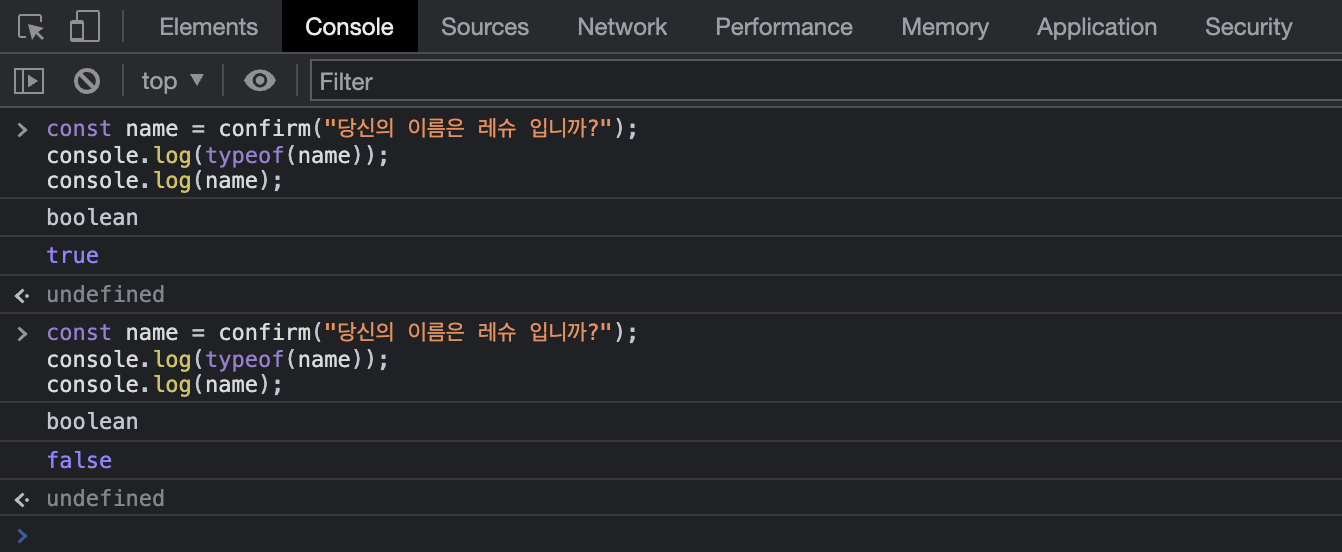 - alert()과 차이는 alert() 은 확인만 뜨지만, confirm은 확인(true)과 취소(false)가 있다 (typeof로 확인 시 boolean)