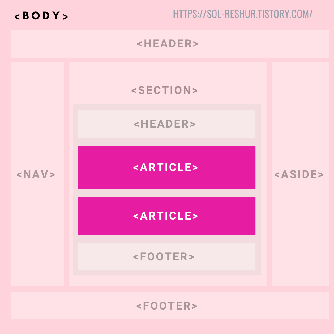 - <article> 자체가 콘텐츠가 될 수 있지만 제목을 사용할 땐 <h2> ~ <h3>을 이용하여 나타낸다.