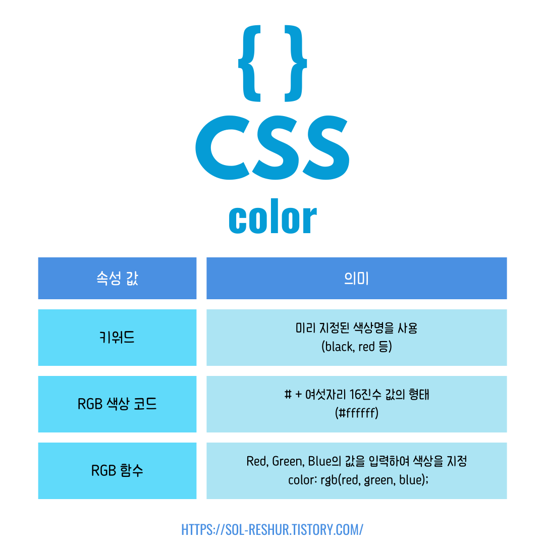 - RGB 색상 코드 : 각각 두자리씩 끊어서 작성하며 00부터 FF까지 #과 함께 16진수를 입력하면 된다.
